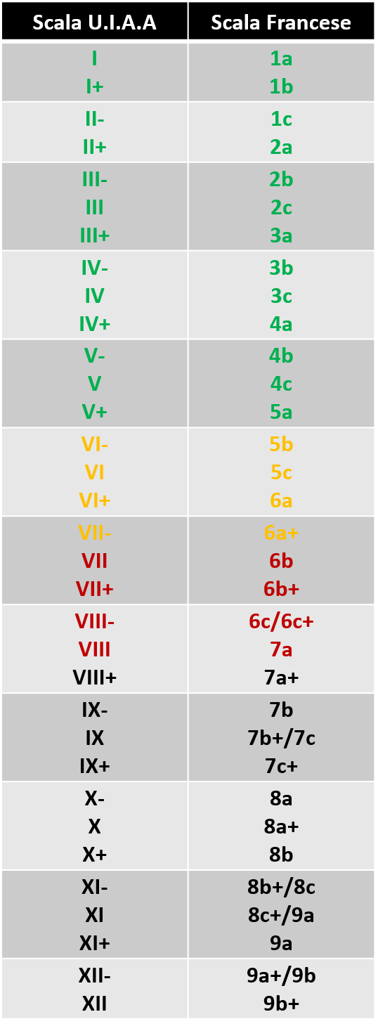 (8) Difficoltà d’InsiemeData per assodato una conoscenza di massima della complementarietà ed equivalenza della scala tradizionale U.I.A.A. con la moderna scala francese, scale di cui si riporta comunque di seguito una tabella comparativa, nella presente raccolta si è provveduto ad utilizzarle entrambe con un criterio da demandarsi essenzialmente alla tipologia di salita: è stata preferibilmente utilizzata la scala U.I.A.A. per gli itinerari classici mentre è stata preferita la scala Francese per quelli moderni. ![]() Per gli itinerari moderni viene sempre data anche una indicazione delle difficoltà obbligatorie intese come le massime necessariamente da affrontarsi con l’utilizzo delle attrezzature in essere; il che significa ovviamente che il ricorso a chiodatura aggiuntiva implica automaticamente una contrazione di tale “obbligatorietà”. (7.2.) 2° parametro: Fattore di rischio E’ un parametro che fa riferimento essenzialmente alla possibilità della cordata di procedere in sicurezza in relazione alla quantità e alla qualità delle protezioni già esistenti in loco e alla facilità o meno di procedere ad integrazioni delle medesime. Il requisito della proteggibilità fa riferimento sicuramente all’innegabile tendenza a privilegiare itinerari dove le sicurezze esistenti o quelle apponibili dalla cordata siano tali da configurare livelli di rischio complessivamente accettabili; retaggio dell’arrampicata sportiva portata sulle pareti o tendenza involutiva dell’alpinismo questo è un tema la cui discettazione non compete a tale parte introduttiva ed in generale a queste pagine! Nella presente raccolta viene utilizzata la seguente scala con ricorso alla lettera “R” quando è in considerazione un itinerario con chiodatura tradizionale, alla lettera “S” se la chiodatura è a spit o alla “F” se a fix cioè con il ricorso a chiodatura che ha comportato la pre-foratura della roccia sia con mezzi meccanici (leggasi trapano) che manuali (leggasi pianta spit/fix). Tutte le gradazioni possono essere accompagnata da un “+” che pur sancendo un inasprimento del livello di problematicità del percorso non ne sancisce il passaggio al livello superiore. Nello specifico le scale di valutazione comunemente adottate sono le seguenti: R1 : protezione sempre facilmente realizzabile con presenza di numerosi e ottimi punti di ancoraggio; la caduta massima teorica è di qualche metro ed il volo non dovrebbe comportare di massima nessun danno rilevante. R2: proteggibilità che si mantiene elevata con punti di ancoraggio sempre ottimi anche se più radi; vi sono dei tratti da superarsi obbligatoriamente fra una protezione e l’altra; anche in questo caso il volo non dovrebbe superare qualche metro o comportare conseguenze. R3: la proteggibilità incomincia a scendere significativamente; talvolta nelle lunghezza le sicurezze sono poco affidabili ed aleatorie; lunghi tratti non proteggibili (anche 6/7 metri) e volo che potrebbe comportare un infortunio. R4: la difficoltà di usufruire di protezioni adeguate scende sensibilmente; talvolta è necessario affidarsi ad ancoraggi che terrebbero solo un volo di piccola entità e superare sezioni anche di 8/10 metri senza adeguate protezioni; la probabilità di andare incontro ad un infortunio in caso di volo è alta. R5: le protezioni divengono scarse o inaffidabili con lunghi tratti obbligatori (12/15 metri); un volo comporterebbe quasi con certezza un infortunio. R6: la proteggibilità diviene insignificante con protezioni di fatto inesistenti o inaffidabili; una caduta può comportare danni letali. S1: spittatura ravvicinata da falesia od assimilabile; generalmente non superiore ai 3/4 metri; un eventuale volo è breve e non dovrebbe assolutamente comportare conseguenze. S2: spittatura più rarefatta ma non superiore ai 5/6 metri; tratti obbligatori; anche in questo caso il volo di lunghezza massima teorica non è superiore ai 10 metri e non dovrebbe comportare conseguenze. S3: la spittatura diviene più rarefatta con distanza anche superiore ai 5/6 metri e la progressione comporta quasi sempre passaggi obbligatori; il volo può comportare conseguenze. S4: la spittatura diviene decisamente distanziata (7 metri ed oltre); il volo ha un’alta probabilità di comportare un infortunio. S5: spittatura oltre i 10 metri con caduta quasi sicuramente destinata a provocare un infortunio. S6: spittatura molto rarefatta o solo parziale anche oltre i 20 metri; la caduta può avere effetti letali. F1: stessa metodologia di valutazione del livello S1 ma con un fattore di resistenza dell’ancoraggio alla sollecitazione in caso di volo superiore in relazione alle caratteristiche specifiche dei fix (fattore di tenuta al taglio e all’estrazione significativamente superiori già con fix da 8 mm; molto superiori con fix da 10 mm); ne deriva un livello di sicurezza complessivo marcatamente più elevato a parità di numero e frequenza degli ancoraggi. F2: come per il livello S2 con le specifiche riportate per il livello F1 F3: come per il livello S3 con le specifiche riportate per il livello F1 F4: come per il livello S4 con le specifiche riportate per il livello F1 F5: come per il livello S5 con le specifiche riportate per il livello F1 F6: come per il livello S6 con le specifiche riportate per il livello F1 (7.3.) 3° parametro: Impegno globale E’ il terzo componente del giudizio di “Valutazione estesa” e ed è forse il più significativo in termini di innovazione. Fa riferimento essenzialmente a tutti quegli elementi che risultano esterni alla difficoltà pura della progressione arrampicatoria ma che vengono inevitabilmente ad incidere sulla difficoltà propriamente complessiva della salita; si fa riferimento cioè alla lunghezza dell’approccio, ad eventuali difficoltà che il medesimo può comportare, alla severità o amenità dell’ambiente circostante ed al suo conseguente ed innegabile peso psicologico con riferimento anche ad un eve